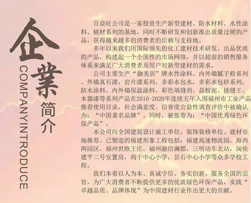 2、福州百益旺公司“鉫美居”天然真石漆采用硅丙乳液、純丙乳液, 高性能、高性?xún)r(jià)比,優(yōu)異的耐黃變性,耐候性好,耐久性
